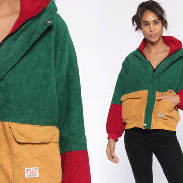 Product Name: Hooded color block corduroy jacket green best sale