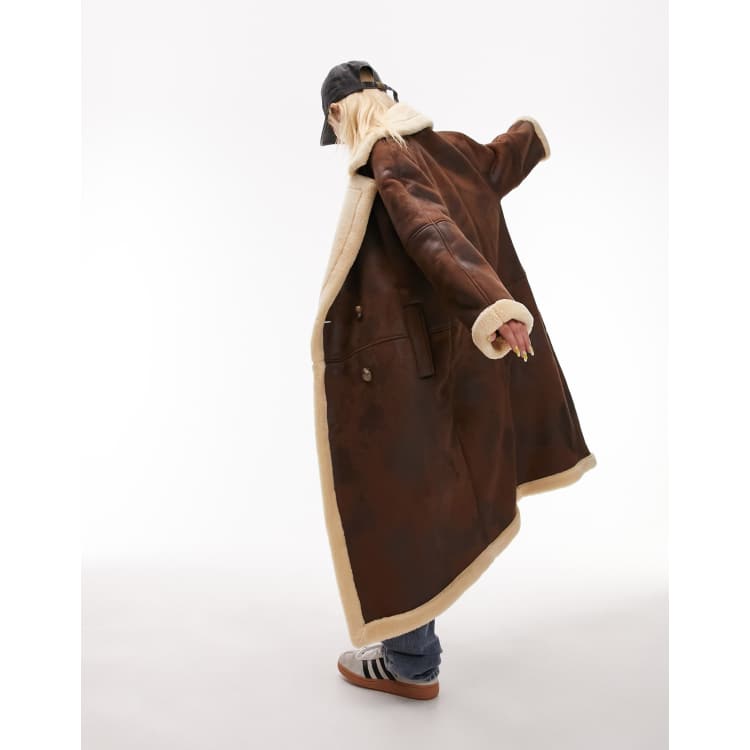 • Topshop Petite long line aviator coat in brown ASOS